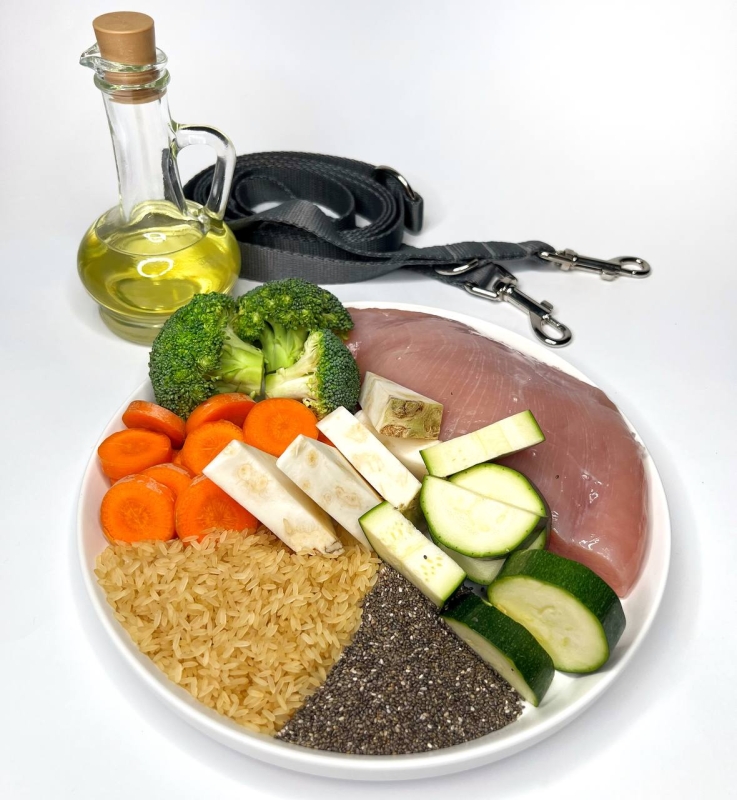 Vollständige Zusammensetzung: Putenbrustfleisch – 50 %, Reis – 10%, Karotten , Zucchini,  Brokkoli, Sellerie, Chiasamen, Vitamine, Fischöl, Fleisch- und Gemüsebrühe